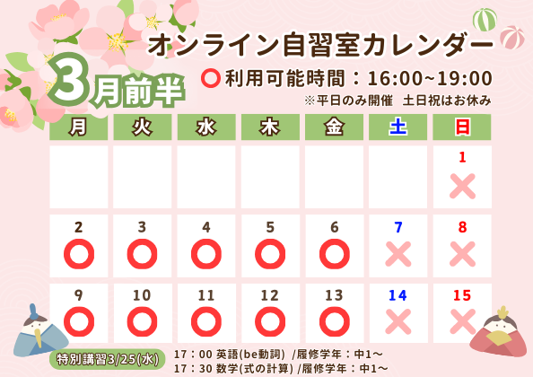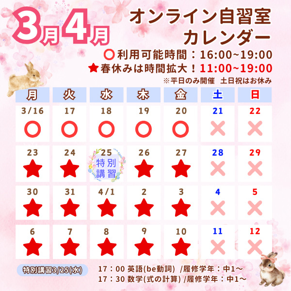 いつもオンライン自習室をご利用いただきありがとうございます。 今月も先生たちが画面の向こうで皆さんをお待ちしています! 毎日の学習リズム作りに、ぜひご活用ください。